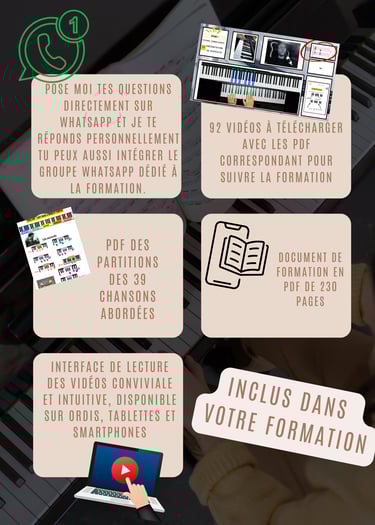 C'est le grand "plus" de cette formation : chaque vidéo est accompagnée d'un document PDF d'une ou plusieurs pages, où toutes les notions évoquées dans la vidéo sont expliquées, avec des schémas, des partitions, des explications détaillées. Le document, qui compte au total 230 pages, peut être téléchargé partie par partie ou en intégralité, selon ta préférence, et fait partie de la formation. Il te permettra de bien suivre, de ne rater aucune notion, et même de réviser "hors ligne" avant de dormir... ou au petit déj !