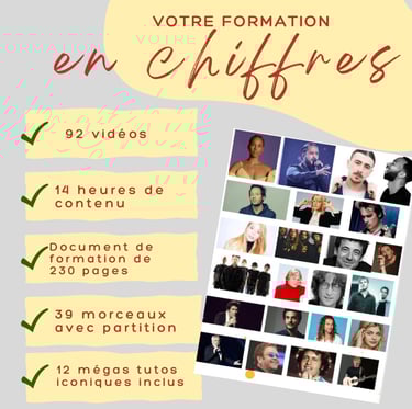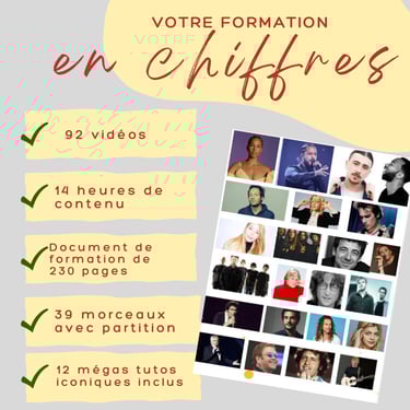 C'est le grand "plus" de cette formation : chaque vidéo est accompagnée d'un document PDF d'une ou plusieurs pages, où toutes les notions évoquées dans la vidéo sont expliquées, avec des schémas, des partitions, des explications détaillées. Le document, qui compte au total 230 pages, peut être téléchargé partie par partie ou en intégralité, selon ta préférence, et fait partie de la formation. Il te permettra de bien suivre, de ne rater aucune notion, et même de réviser "hors ligne" avant de dormir... ou au petit déj !