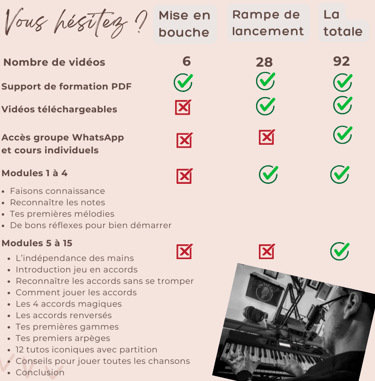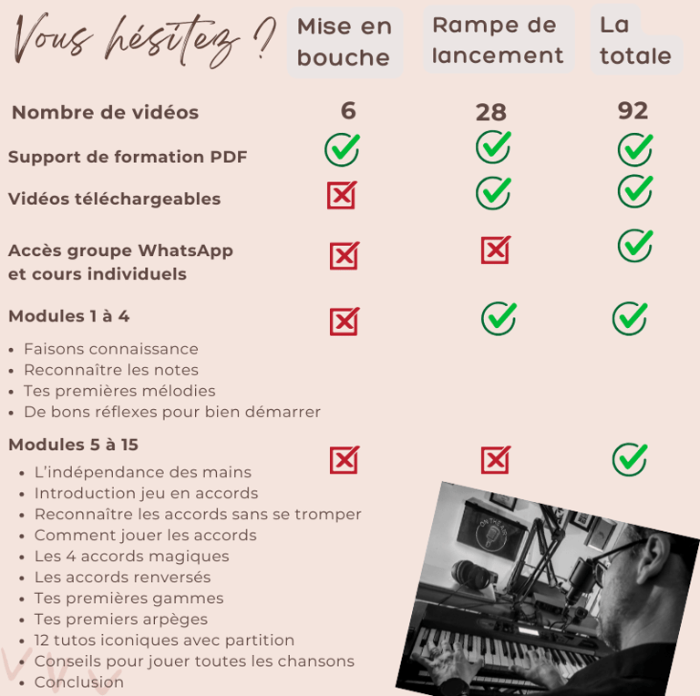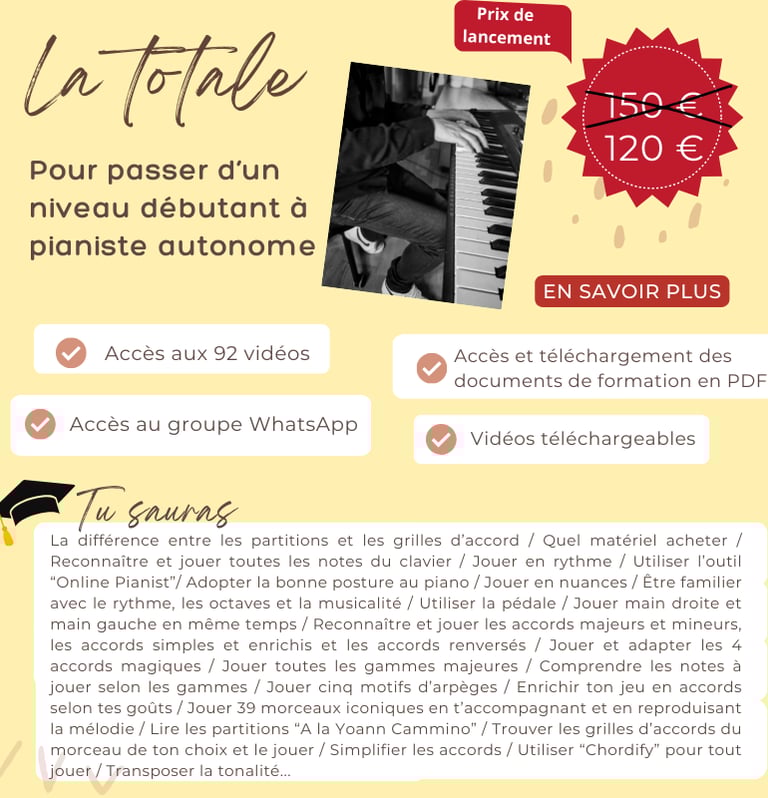 Avec une méthode innovante basée sur le plaisir de jouer et le jeu en accords, Yoann Cammino, professeur de piano et formateur, vous guide pas à pas, avec cette formation unique en son genre. Au menu : du plaisir et une approche sérieuse qui a fait ses preuves auprès de ses 80.000 abonnés sur TikTok, accessible aux débutants de tous les âges.